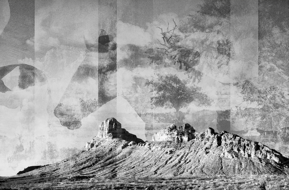This is a limited, one-of-a-kind print that holds a special place in my heart. The backing photo is a 9-shot film exposure of horses and landscape on top of the West Texas Forever shot in Van Horn. This piece represents my life as an artist. Light, dark, growth, gritty, beautiful, but chaotic.