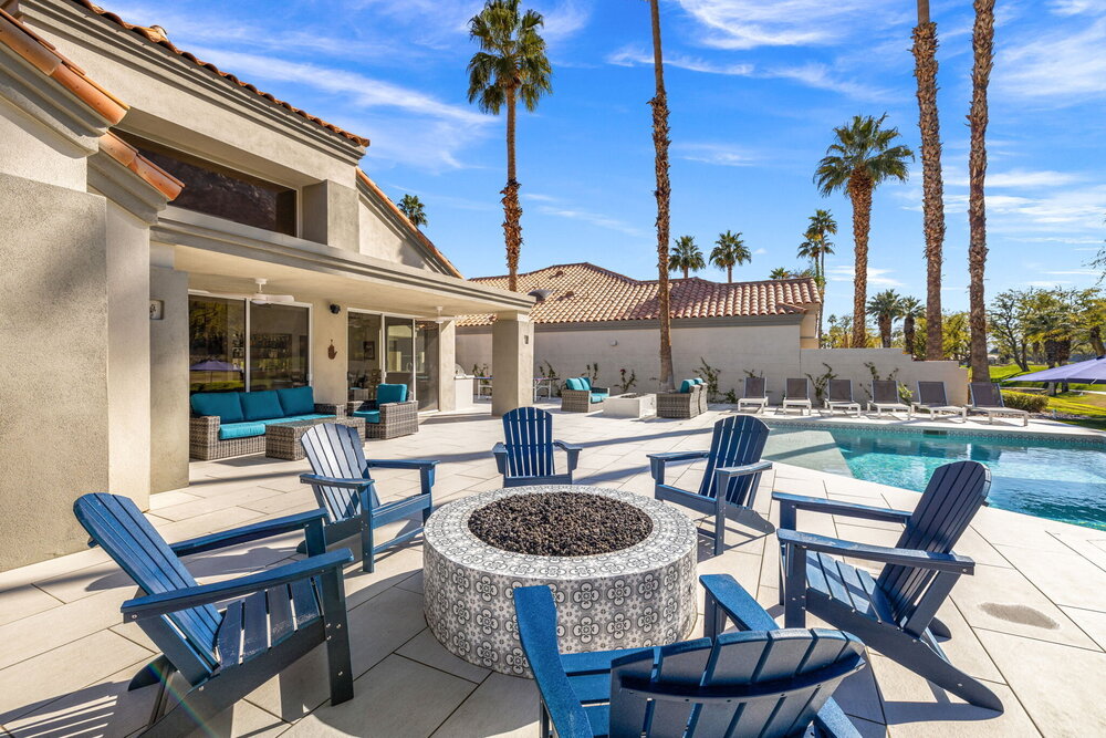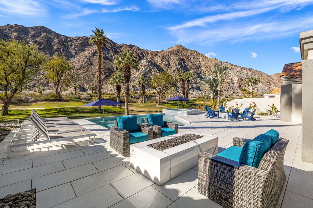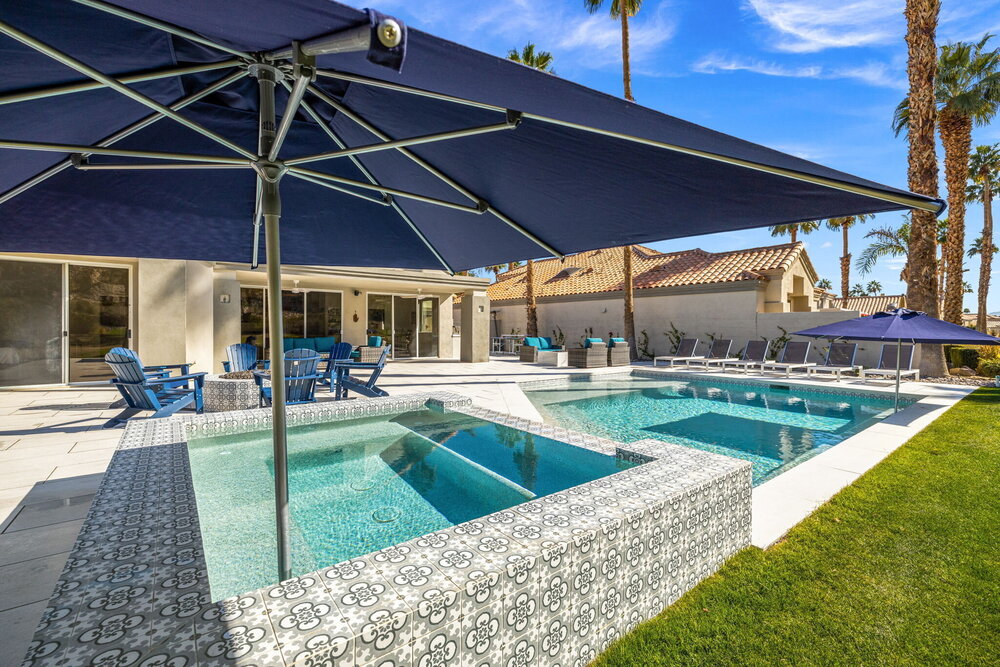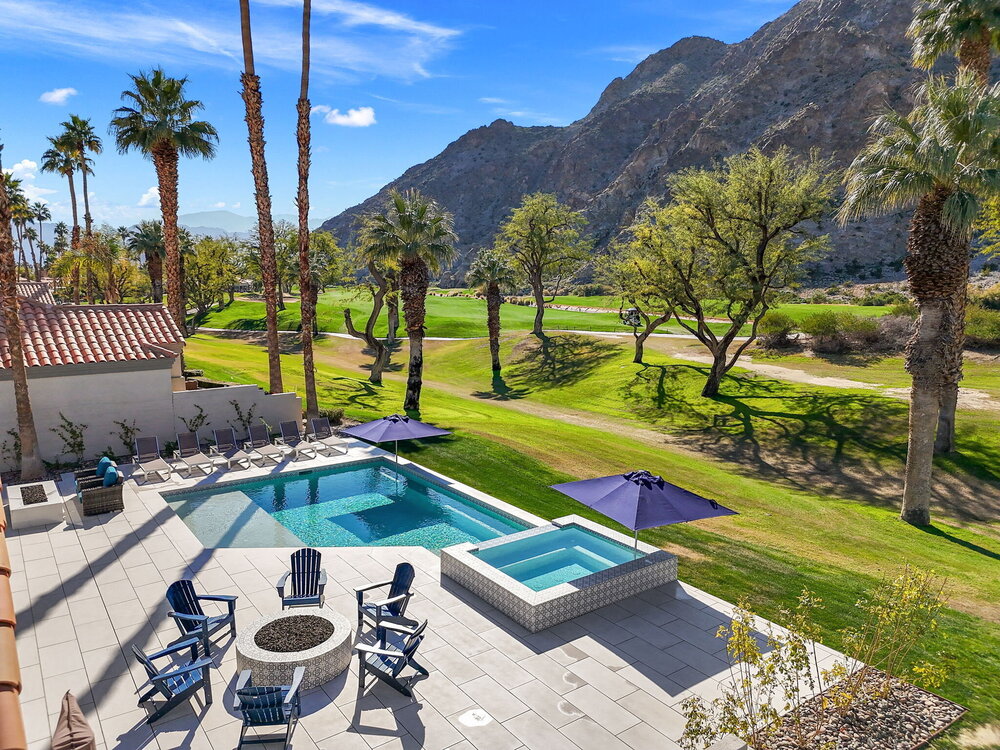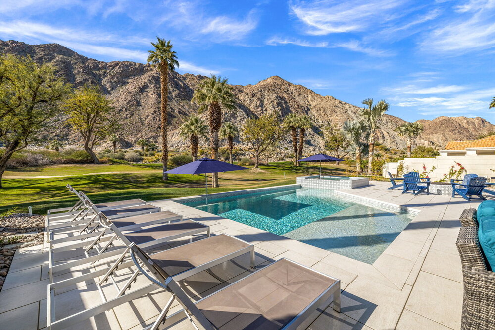 One of the home's best highlights is the backyard that overlooks the famous 15th hole on the Arnold Palmer golf course. We occasionally get visits from herds of rams! Enjoy this dramatic view in our brand-new pool and oversized spa! We have multiple umbrellas that you can put into the holes in the pool or the hot tub, so you have extra shade as needed.