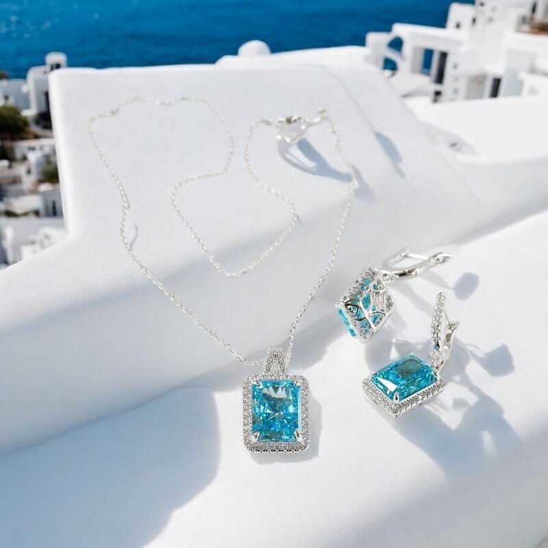 Necklace: At the heart of the Majestic Aquamarine Necklace lies a dazzling simulated aquamarine stone in an intricate ice-cut shape. This unique cut enhances the stone’s natural clarity, allowing it to sparkle with every movement, while the soft, cool blue hue captures the tranquil beauty of the ocean. The cubic zirconia accents surrounding the aquamarine add a touch of brilliance, creating an eye-catching halo that amplifies the stone’s luminosity.
