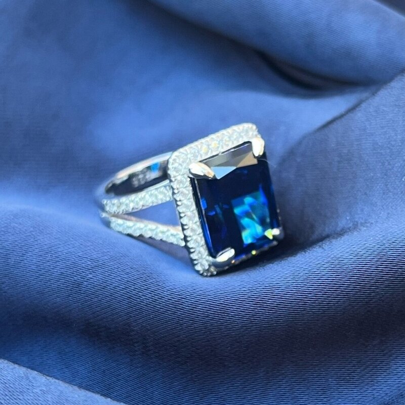 Surrounding the sapphire is a halo of sparkling cubic zirconia stones, carefully selected for their brilliant shine and clarity, which add a touch of glamour and elevate the center stone’s radiance. The cubic zirconia stones are meticulously set to create a continuous burst of brilliance, offering a refined and elegant contrast to the deep blue of the sapphire.
