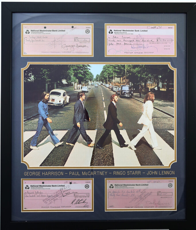 THE BEATLES FRAMED DISPLAY FEATURING CHECKS AND FAMED ABBEY ROAD PHOTO. CHECKS ARE AUTHORIZED REPRODUCTIONS - 1 EACH FROM THE FAB FOUR WITH FAMED PHOTO OF THE BAND WALKING ABBEY ROAD